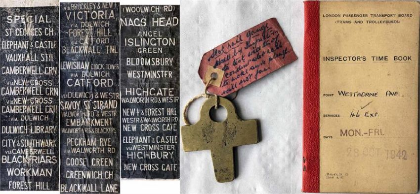 London TRAM ITEMS ex LT tram inspector comprising 1942 INSPECTOR'S TIMEBOOK for service 46 Ex at point Westhorne Ave, a BRASS GAUGE for testing the width of the conduit slot and a c1940s DESTINATION BLIND, depôt unknown but possibly New Cross, complete but heavily used and worn. [3]