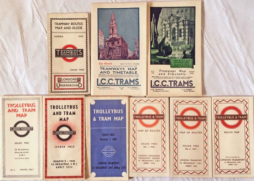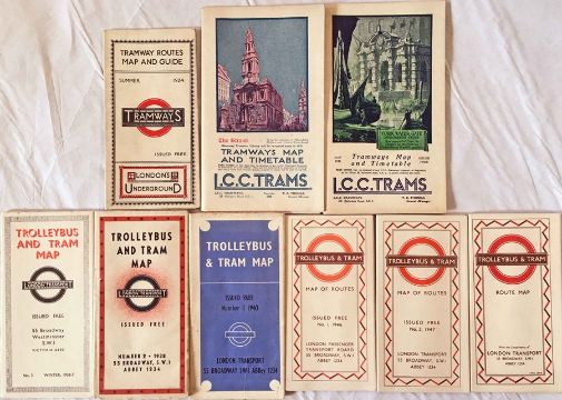 Selection (9) of Underground Group Tramways, LCC Tramways & London Transport trolleybus & tram POCKET MAPS dated from 1924 to 1949. Most are in very good condition. [9]