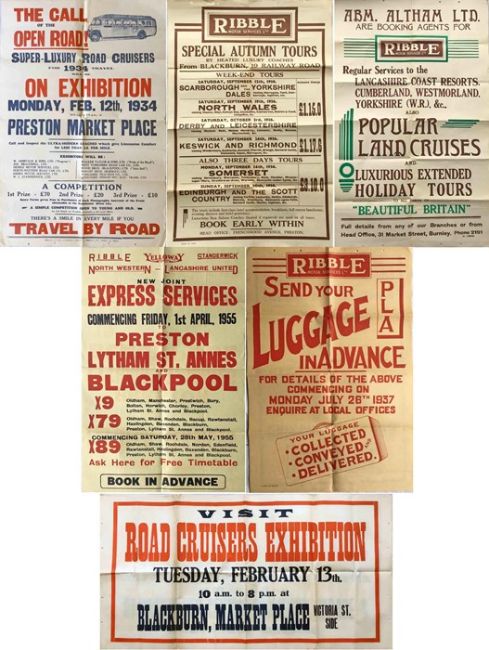 Selection of 1930s (mainly) Ribble Motors Services etc POSTERS (double-crown, double-royal etc) regarding tours, road cruises, land cruises. Includes 4 different versions of the Road Cruisers Exhibition poster, just one is pictured. Posters are generally good, some have filing punch-holes at the edges, all are folded. [9]
