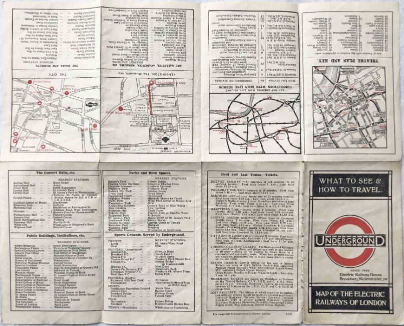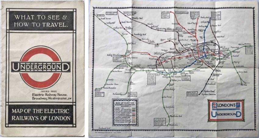 1922 London Underground MAP OF THE ELECTRIC RAILWAYS OF LONDON 'What to See & How to Travel' with issue date 1-3-22. Designed by MacDonald Gill with calligraphed station names, the map opens out to 13.5" x 11" (34 x 28cm). A good copy with some creasing and a couple of very short inward fold-tears. [1]