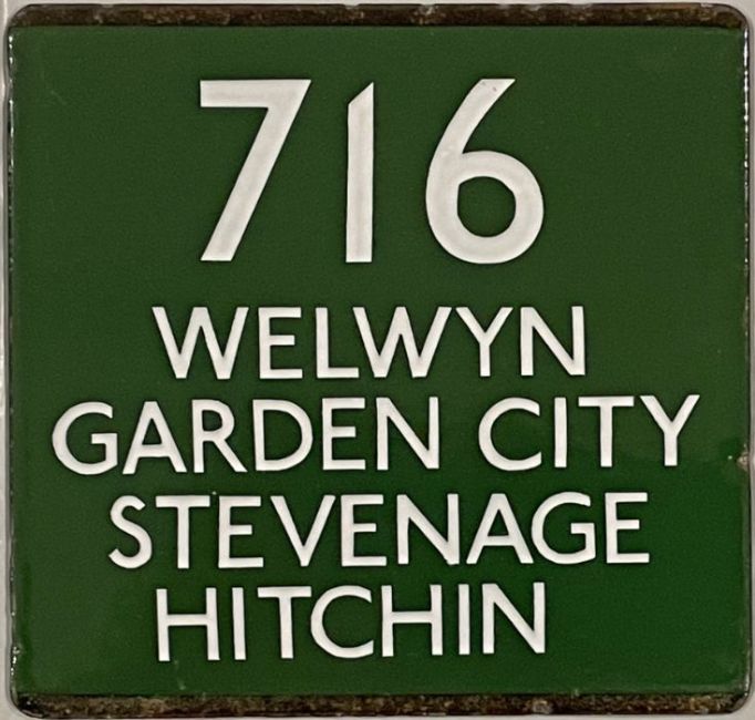 London Transport coach stop enamel E-PLATE for Green Line route 716 destinated Welwyn Garden City, Stevenage, Hitchin. These were recorded from the Albert Hall to Hadley Highstone. In very good, ex-use condition. [1]